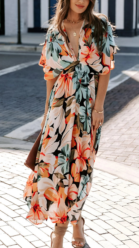 Alizée – Czeska sukienka maxi z głębokim dekoltem w kształcie litery V w kwiaty
