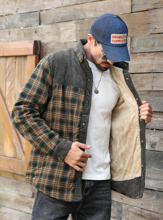 Męska kurtka z flaneli w kratę z podszewką z polaru Sherpa