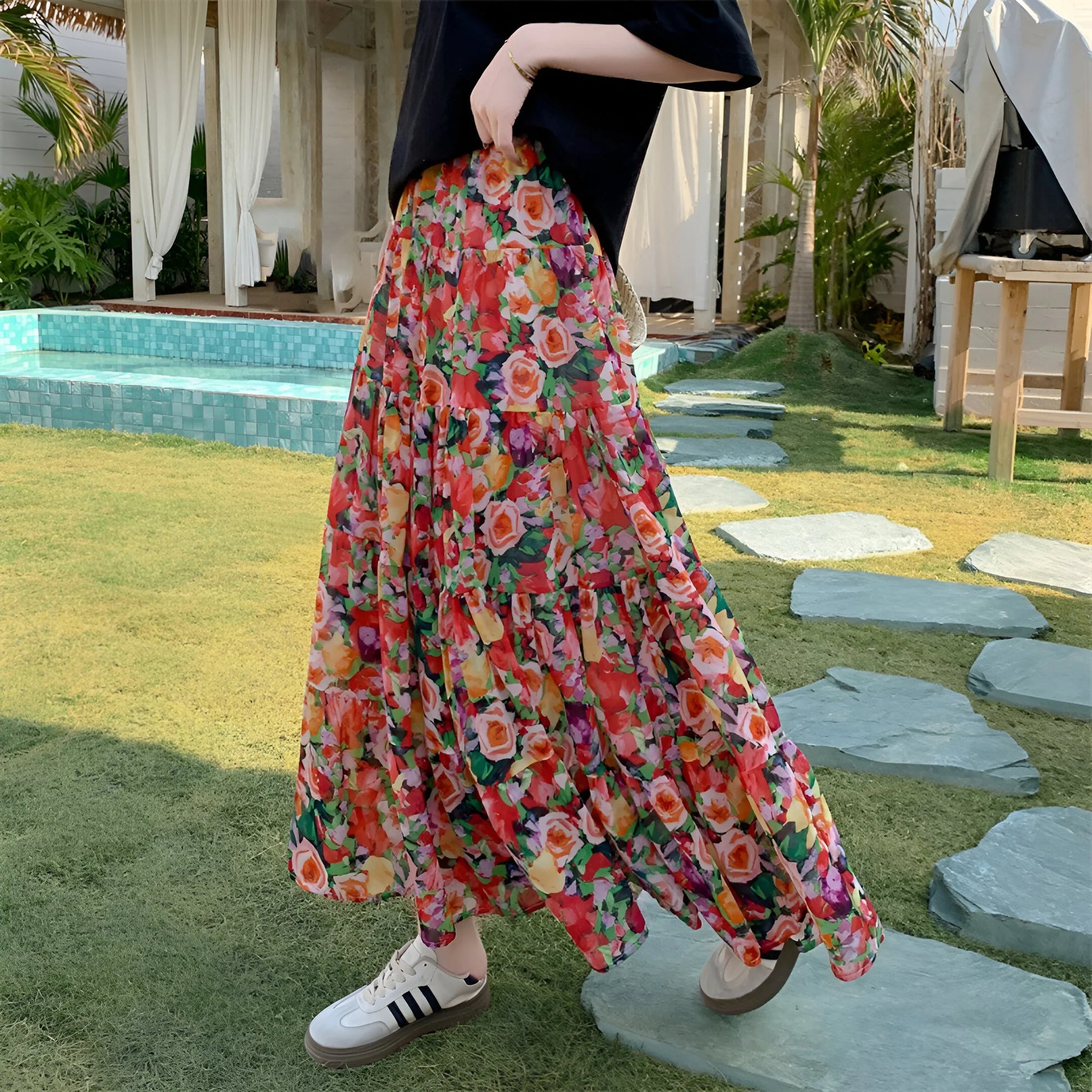Daj się porwać wolnemu duchowi lata z naszą Elegancką Kwiecistą Spódnicą Boho, żywym hołdem dla kobiecości i wygody. Wykonana z płynnej, lekkiej tkaniny, tańczy z każdym Twoim krokiem i podkreśla każdą sylwetkę.
