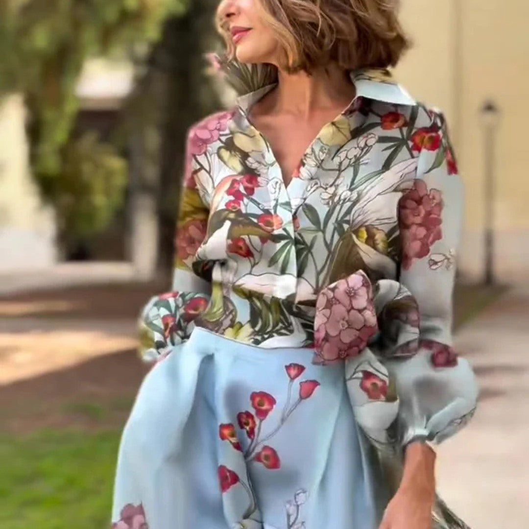 Manon – Retro jedwabny kwiatowy dwuczęściowy zestaw koszuli i spódnicy
