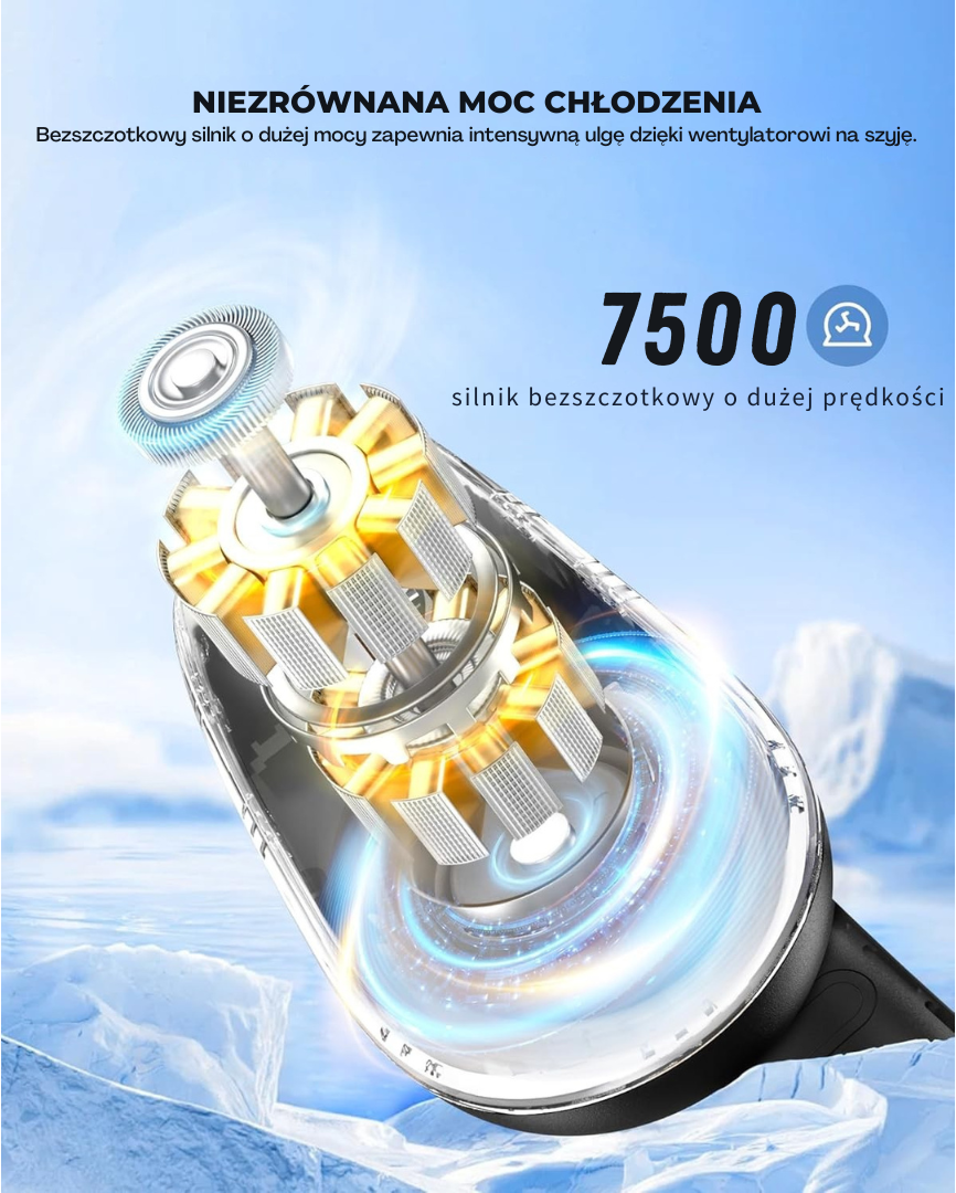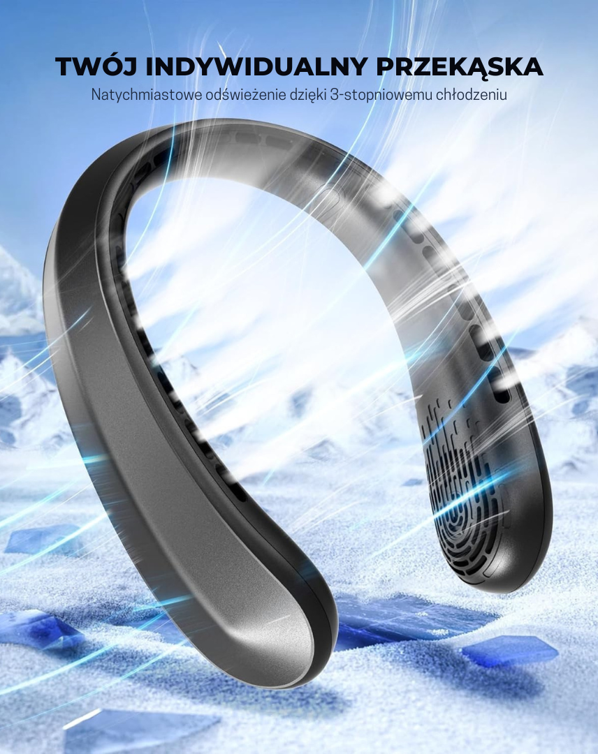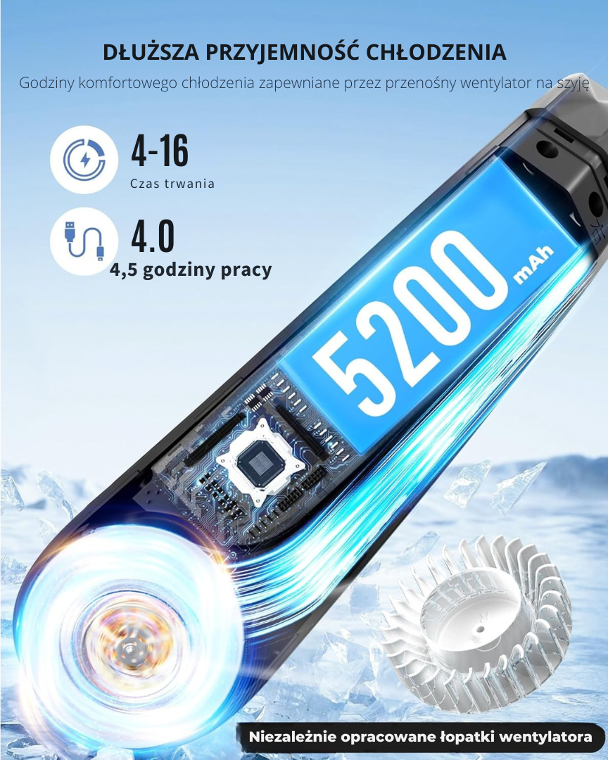 Wydajny wentylator na szyję, 3 prędkości, pojemność 4000 mAh