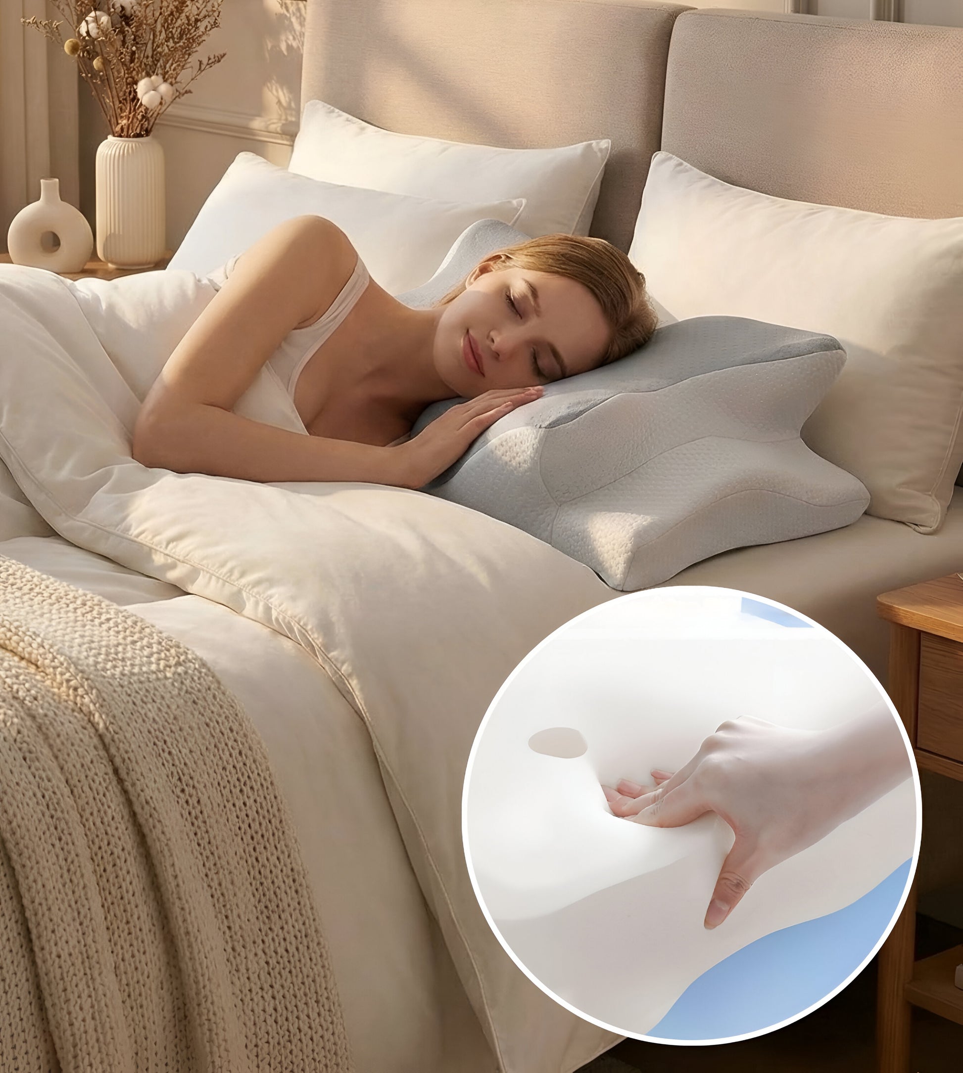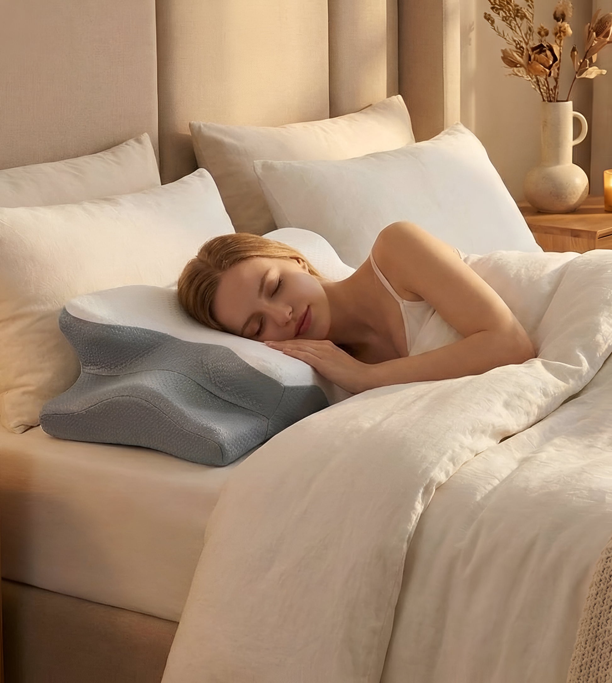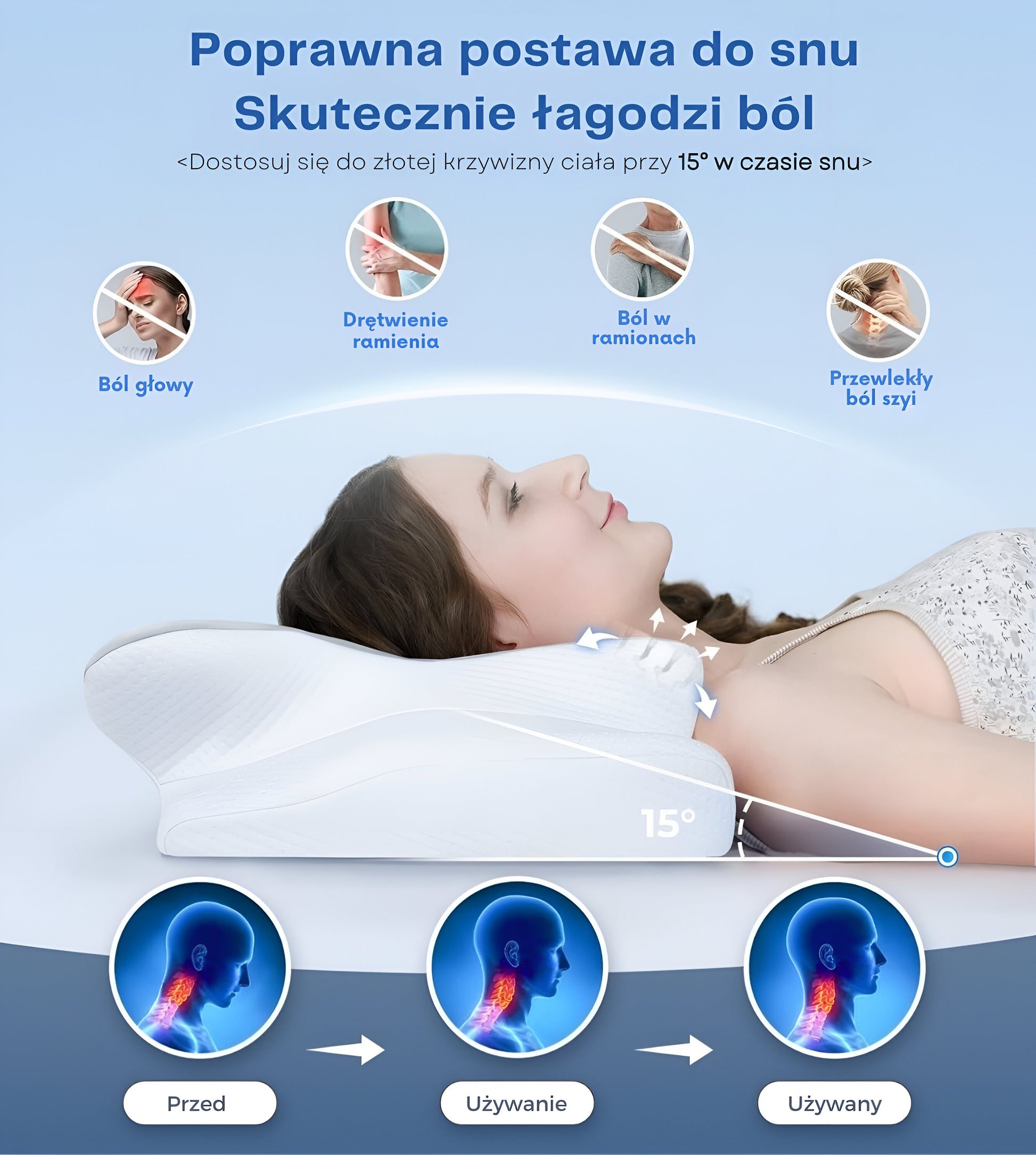 Masz dość rozpoczynania dnia od sztywności karku lub bólu ramion? Poduszka Reliefix™ to rozwiązanie zapewniające spokojny sen i orzeźwiający poranek. Dzięki unikalnemu , wklęsłemu kształtowi o kącie 15° , poduszka delikatnie otula głowę, zachowując jednocześnie naturalne wygięcie szyi. Zaprojektowano ją tak, aby prawidłowo ułożyć kręgosłup, łagodząc ból i zapewniając, że obudzisz się zrelaksowany i bezbolesny.