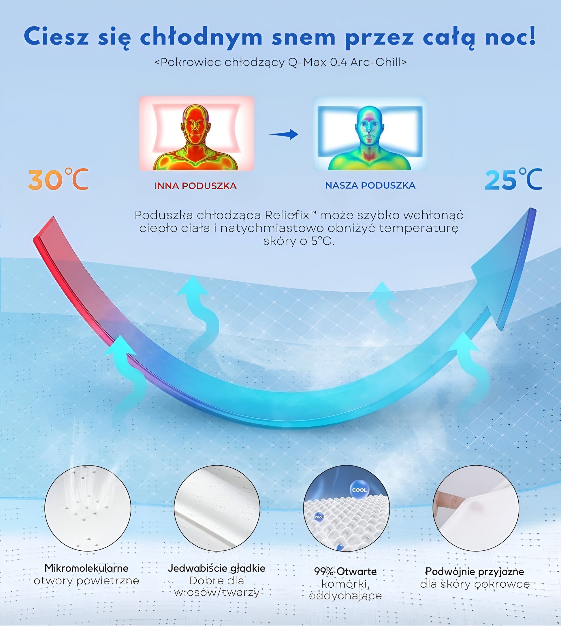 Czy często budzisz się spocony? Doświadcz najwyższego komfortu chłodzenia z Reliefix™ . Zaawansowana poszewka chłodząca Q-Max 0.4 Arc-Chill obniża temperaturę skóry o 5°C , zapewniając kojące, chłodne środowisko do głębokiego snu. Oddychający materiał pomaga regulować temperaturę ciała, dzięki czemu możesz pozostać suchy i komfortowo przez całą noc – koniec z wierceniem się i szukaniem idealnej temperatury do spania.