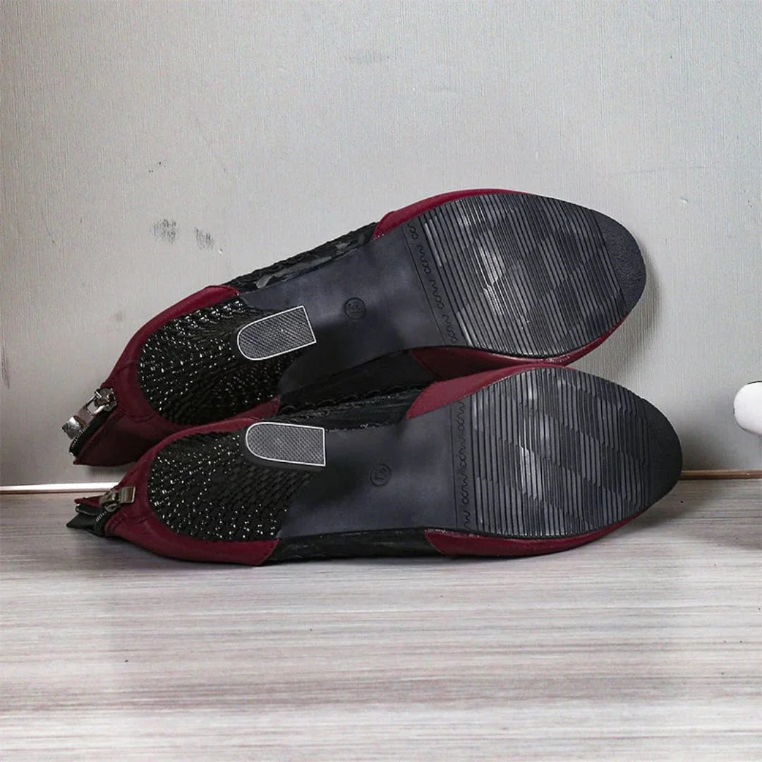 Te wyraziste obcasy łączą w sobie odważny zamsz z delikatną koronką w kwiaty, tworząc oszałamiający kontrast. Idealne do każdego stroju dziennego lub wieczorowego.